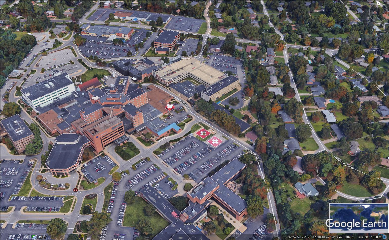 | Hazards: | Large trees North East of helipads across the street. Please avoid flying over large trees as there is a daycare center below. Parking lot light poles to the west. | |||||||||||||||||||||||||